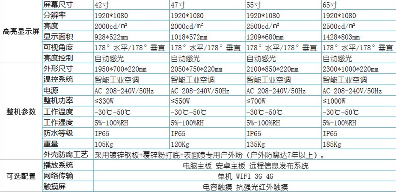 全天候戶外工作2.高亮顯示3.AR防眩光玻璃4.陽光下可視5.內置環保冷媒智能工業空調6.恒溫恒濕防潮防塵維護簡單7.戶外防護等級IP658.落地式安裝,獨有的