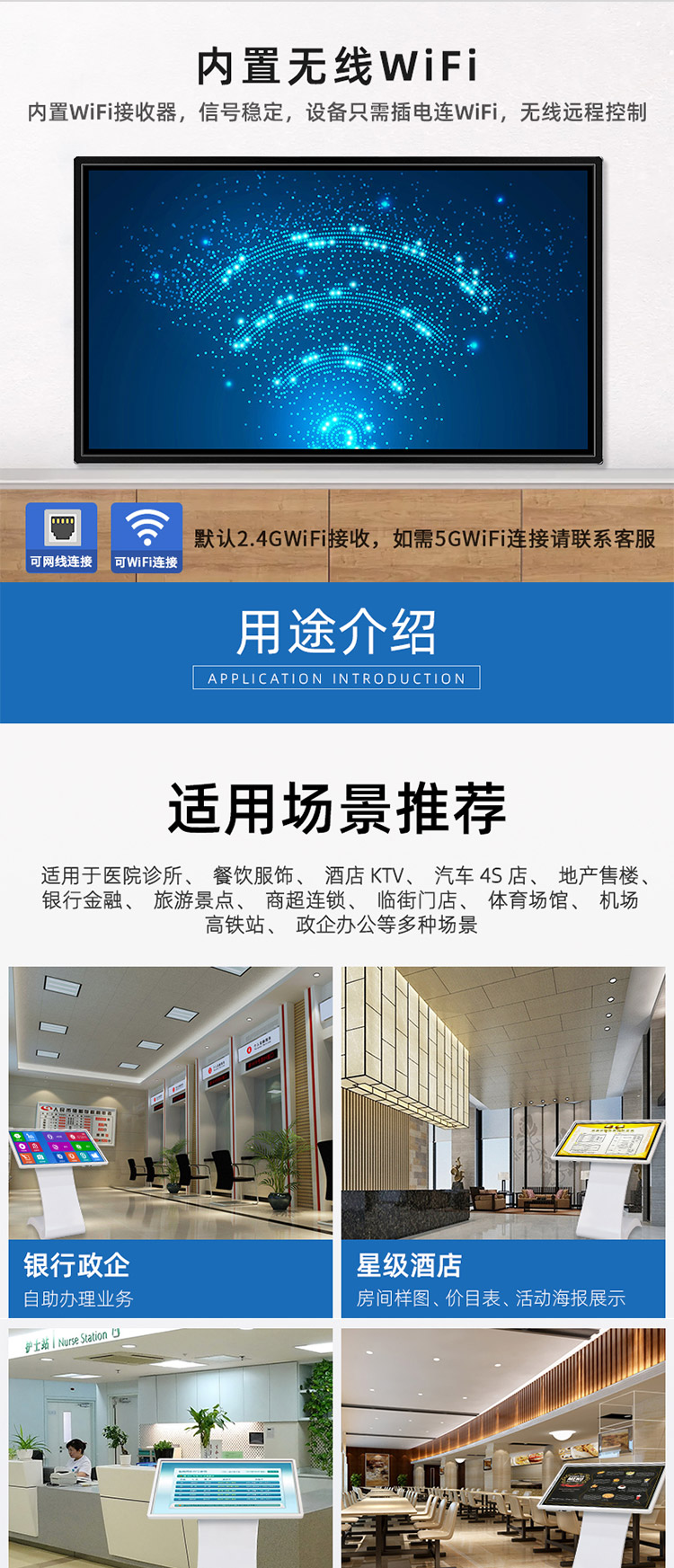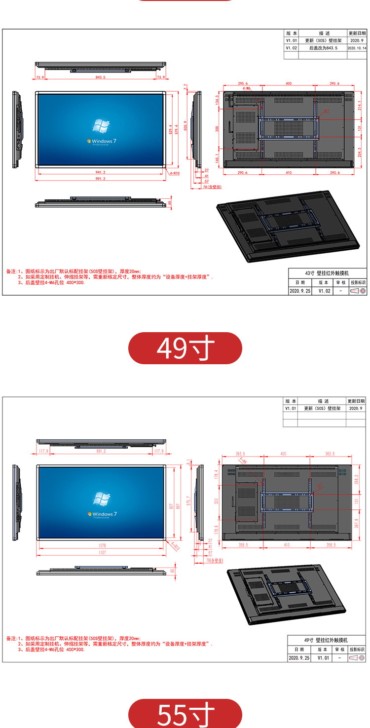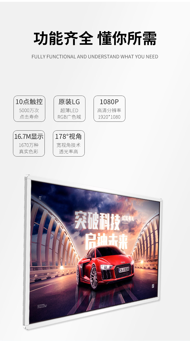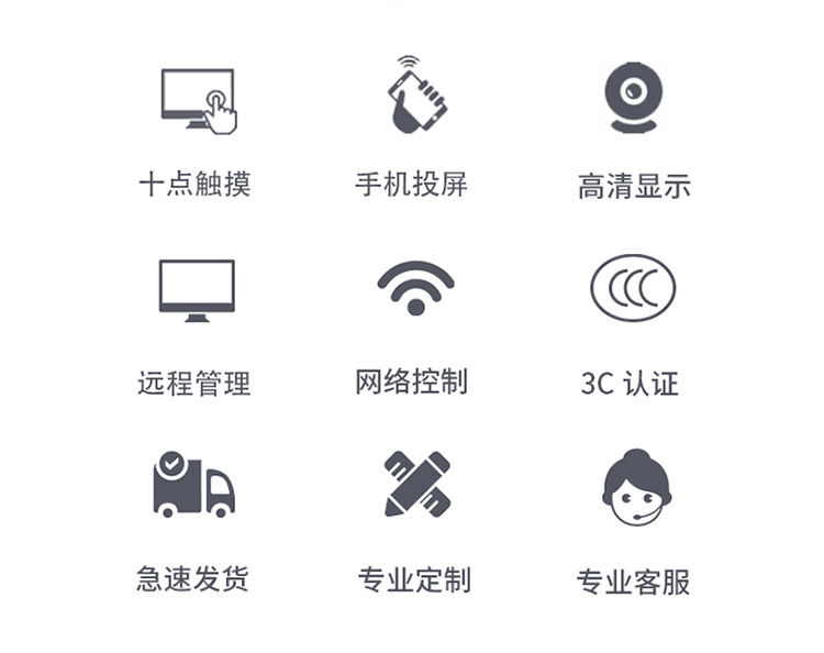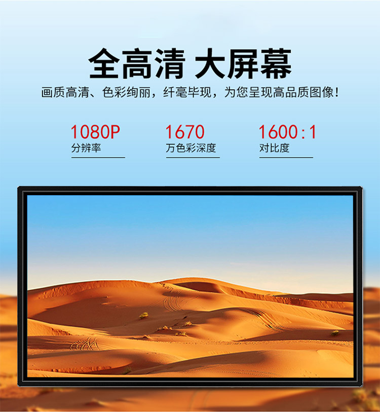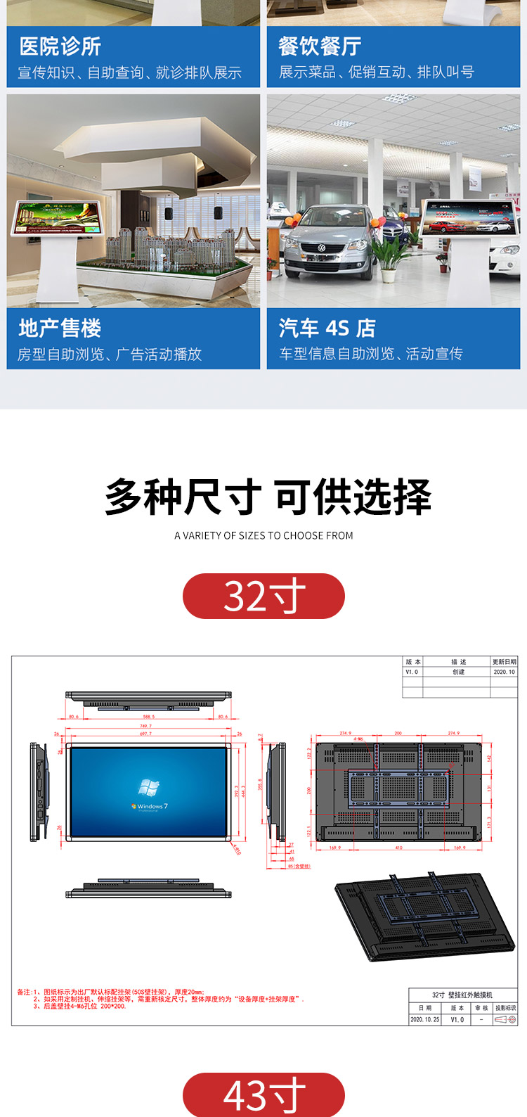 觸摸一體機規格有22寸、32寸、43寸、27寸、55寸、65寸、75寸、86寸、98寸、110寸等規格可選。