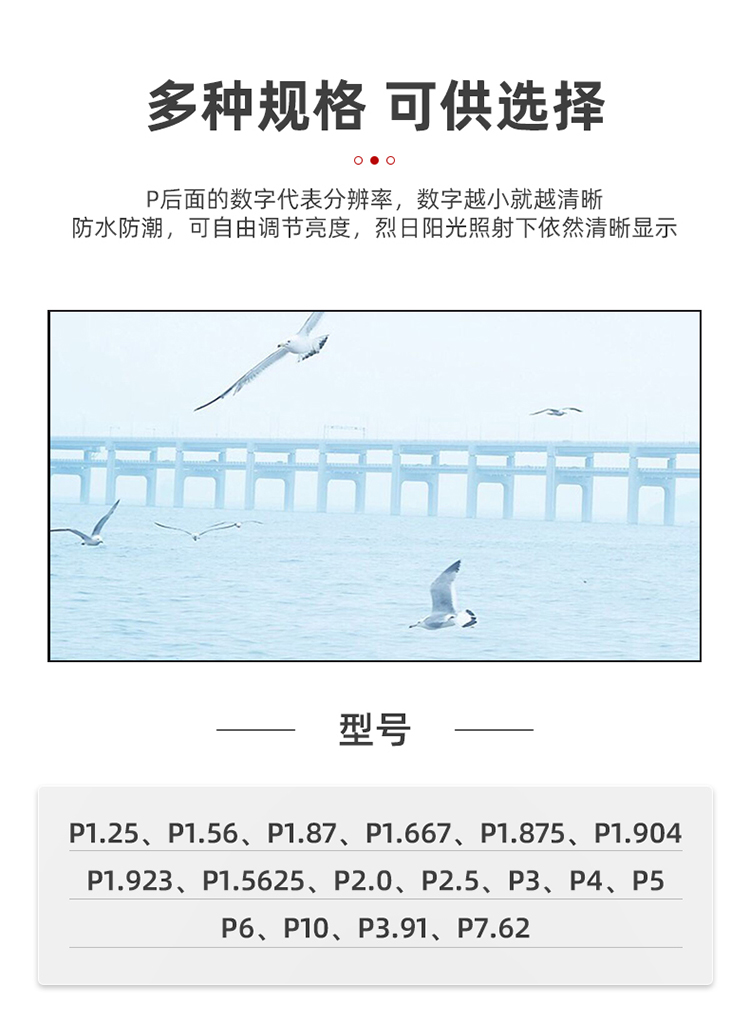 LED顯示屏規格有P10/P8/P6/P5/P4/P3/P2/P2.5/P1.86/P1.53/1.25等一系列規格可選,可應用于學校,展廳,商場,企業等各種場所.